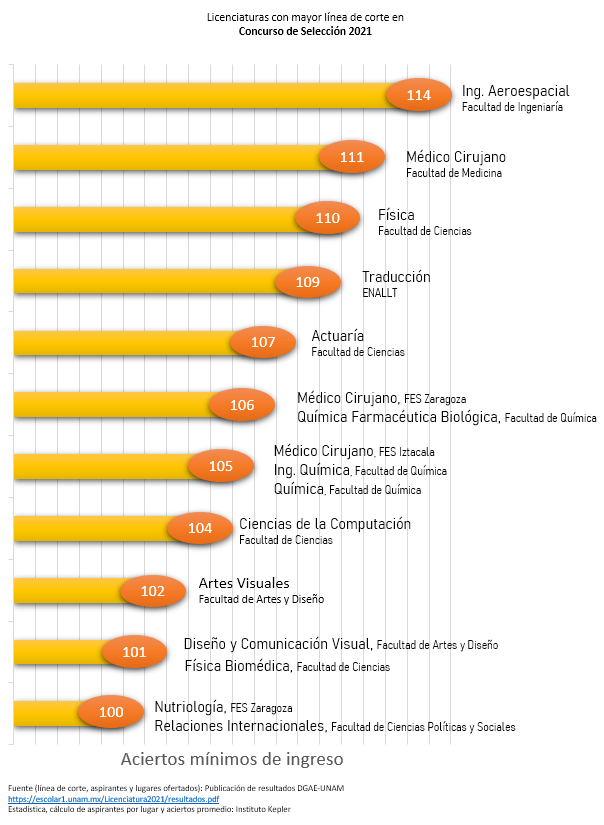 Así podrás medirte y tenerlos de referencia en orden de conocer los aciertos necesarios para entrar en cualquier carrera de la máxima casa de estudios. Conoce los aciertos mínimos de todas las carreras de todos los planteles de la unam que se necesitaron este 2021 para que te prepares mejor para el concurso de selección de 2022.. Los aciertos dependen de los aspirantes que concursan en función de la demanda, la oferta y la preparación de la generación que presenta el examen.